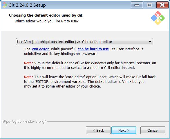 这个页面是在选择Git文件默认的编辑器,很少用到,所以默认Vim即可,直接点“Next”按钮继续到下图的界面: