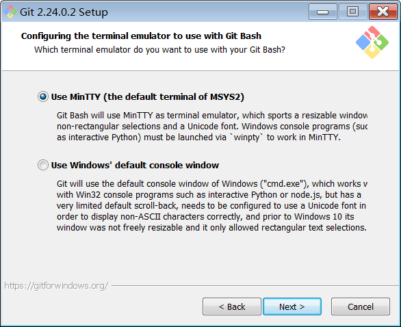 第一个选项是“使用MinTTY(MSYS2的默认终端)”。Git Bash将使用MinTTY作为终端模拟器,该模拟器具有可调整大小的窗口,非矩形选择和Unicode字体。Windows控制台程序(例如交互式Python)必须通过“ winpty”启动才能在MinTTY中运行。