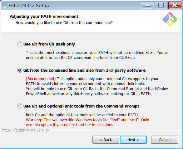 第三种配置是“从命令提示符使用Git和可选的Unix工具”。警告:这将覆盖Windows工具,如 “ find 和 sort ”。只有在了解其含义后才使用此选项。