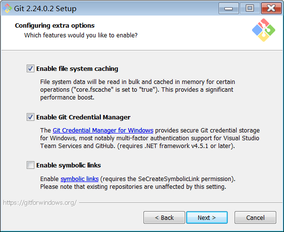 第二个选项是“启用Git凭证管理器”。Windows的Git凭证管理器为Windows提供安全的Git凭证存储,最显着的是对Visual Studio Team Services和GitHub的多因素身份验证支持。 (需要.NET Framework v4.5.1或更高版本)。