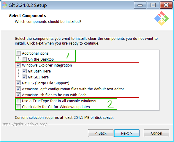 上图红框内的选项是默认勾选的,建议不要动。绿色框1是决定是否在桌面创建快捷方式的。绿色框2是决定在所有控制台窗口中使用TrueType字体和是否每天检查Git是否有Windows更新的。这些根据自己需要选择。